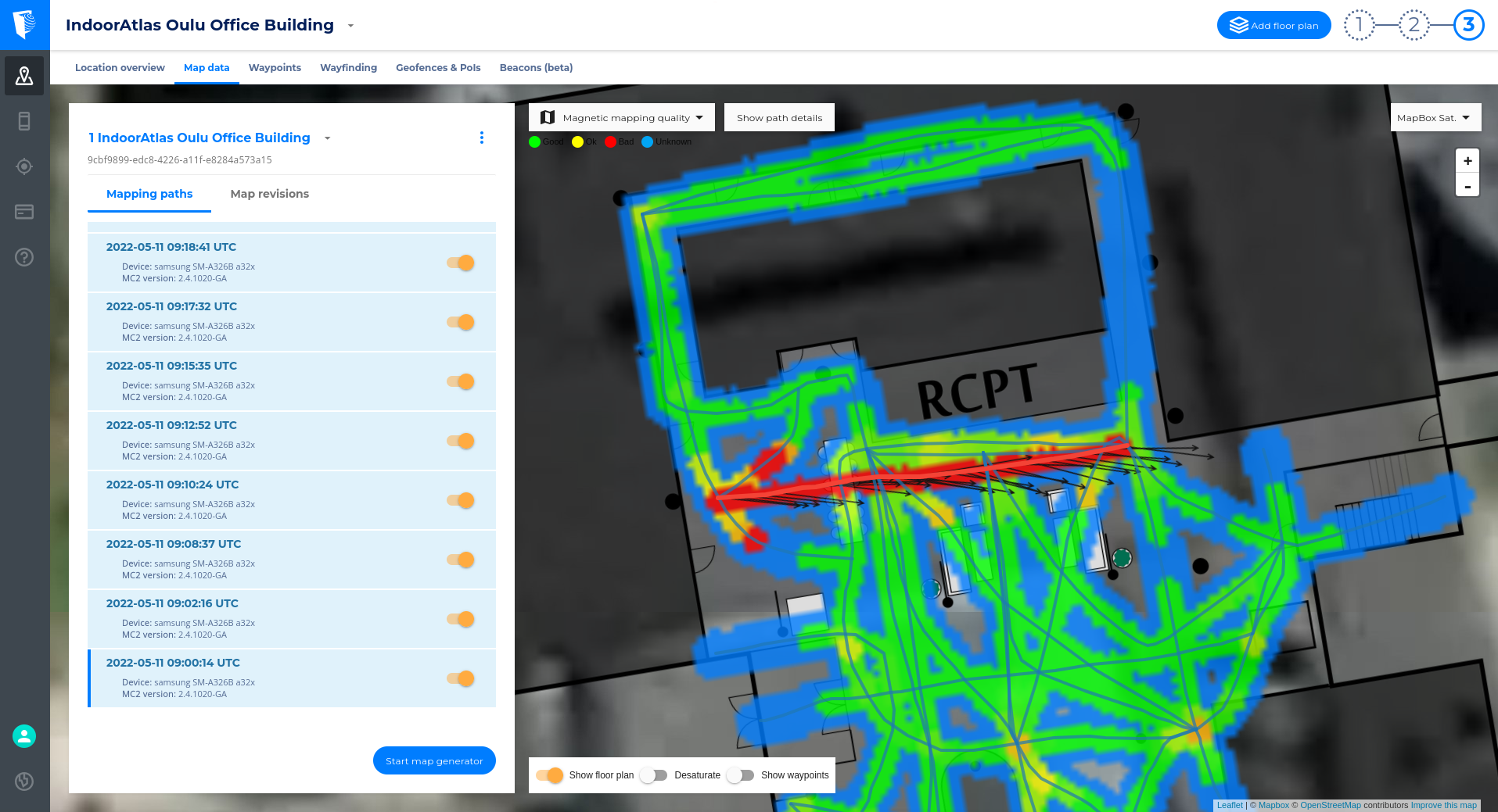 Achieving accurate indoor positioning requires high-quality fingerprinting. Even when waypoint placement and mapping are done carefully, deployment is often an iterative process. To support this, IndoorAtlas provides the Mapping Quality & Coverage view in both MapCreator and the IndoorAtlas Web Tool.